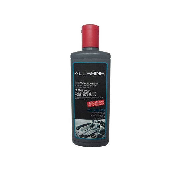 Alveus Allshine – nukalkinimo priemonė nerūdijančio plieno ir kompozitinėms kriauklėms, 250 ml. Efektyviai ir nesudėtingai nuvalo kalkių nuosėdas nuo nerūdijančio plieno bei kompozitinių, akmens masės plautuvių.