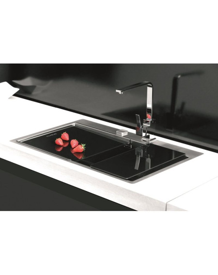 Grūdinto stiklo paviršius pasižymi tvirtumu ir atsparumu temperatūros pokyčiams bei įbrėžimams, o satininis juodas (pusiau matinis) paviršius suteikia elegantišką, modernų vaizdą. Padėkliukas turi lengvą nuolydį, todėl nuo jo nutekantis vanduo patogiai subėga tiesiai į plautuvę – tai itin praktiška plaunant uogas, vaisius ar džiovinant virtuvės įrankius bei indus.