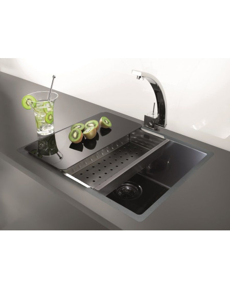 ALVEUS stiklinė pjaustymo lentelė. Pagaminta iš patvaraus grūdinto stiklo. Idealiai tinkama naudoti ant plautuvės dubens kartu su Stylux, Pure, Quadrix, Crystalix, Karat modeliais. Toks sprendimas sutaupo vietos virtuvėje, leidžia patogiai valdyti darbo zonas.