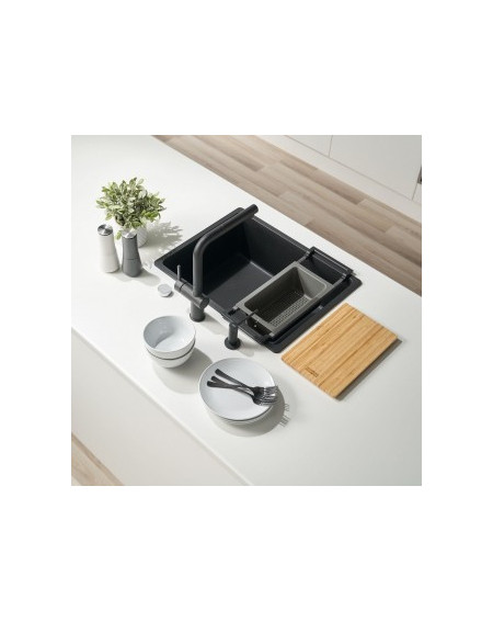Rinkinį sudaro: teleskopinis bėgelis, bambukinė pjaustymo lenta, didelis plastikinis nusausinimo indas.
