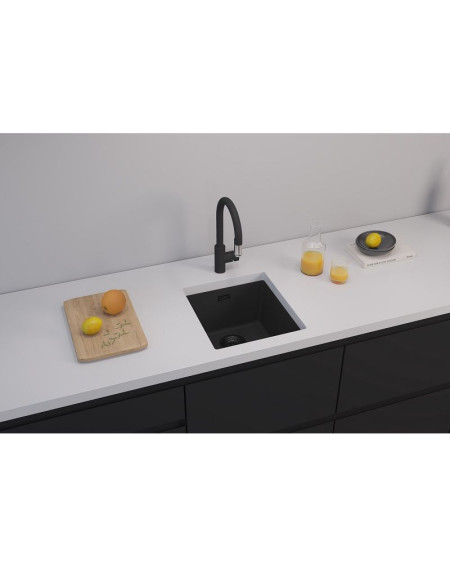 ALVEUS Omni 10 – juodos matinės spalvos granitinė plautuvė iš „Black Edition“ kolekcijos, kuri išsiskiria moderniu dizainu ir patvarumu. Kompaktiški matmenys leidžia ją pritaikyti mažesnėse virtuvėse, o galimas dviejų rūšių montavimas suteikia lankstumo įrengiant.