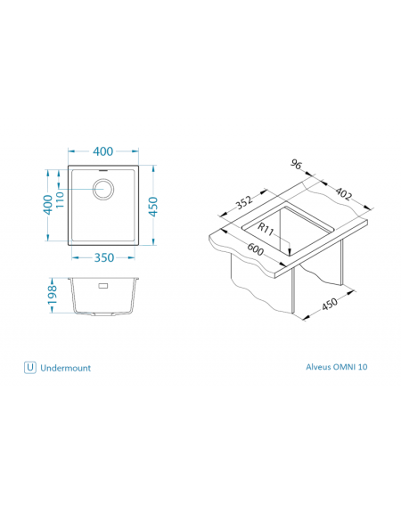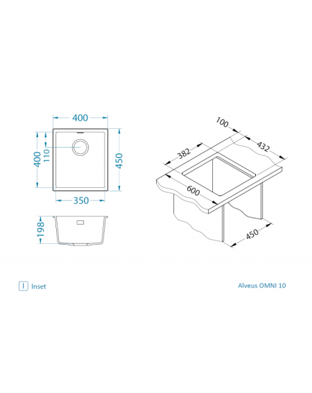 ALVEUS Omni 10 - tai kompaktiška, patikima ir ilgaamžė plautuvė, kuri džiugins ilgus metus.  Plautuvės dubuo (350 x 400 x 198 mm) yra pakankamai gilus, kad patogiai atliktumėte kasdienius darbus. Bendri matmenys (400 x 450 mm) leidžia lengvai pritaikyti ją įvairiose virtuvėse, o 198 mm gylis suteikia komfortą naudojant. Plautuvė tinka spintelėms nuo 450 mm pločio. Plautuvę galima montuoti dviem būdais – kaip standartinę, įleidžiamą į stalviršį (I)(visiems stalviršiams) arba po stalviršiu (U). Montavimas po stalviršiu suderinamas su vandeniui atspariems stalviršiams - akmens, granito, kompozito paviršiais.