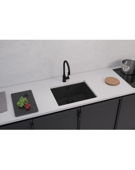 ALVEUS Omni 30 – juodos matinės spalvos granitinė plautuvė, derinanti modernų dizainą ir išskirtinį patvarumą. Pagaminta iš granito kompozito, ji yra atspari įbrėžimams, temperatūrų svyravimams ir lengvai prižiūrima. Gilus dubuo suteikia pakankamai vietos patogiam kasdieniam naudojimui.