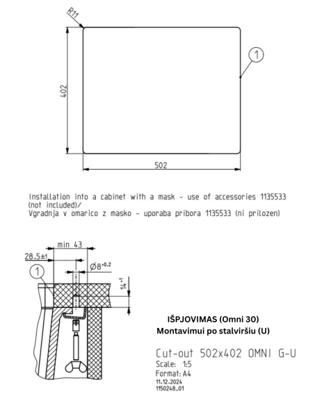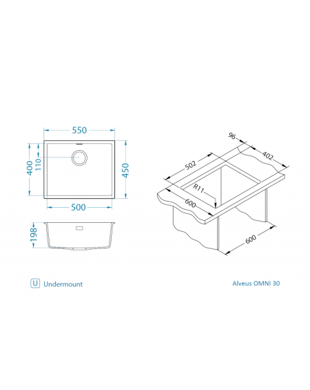 Plautuvės dubuo (500 x 400 x 198 mm) yra gilus ir patogus, todėl lengvai sutalpins net didesnius indus ar kepimo skardas. Bendri matmenys – 550 x 450 mm, montavimui reikalinga nuo 600 mm pločio spintelė. Šis modelis gali būti montuojamas dviem būdais – klasikiniu būdų, montuojant iš viršaus, įleidžiant į stalviršį (I) arba po stalviršiu (U). Tai suteikia lankstumo planuojant virtuvės dizainą.