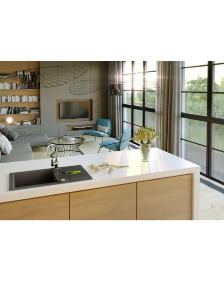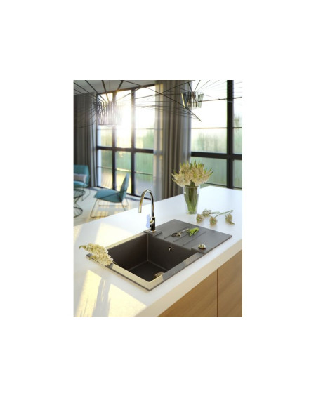 ALVEUS Rock 130 granitinė plautuvė. Tai patogi ir funkcionali plautuvė su plačia nusausinimo zona. Pilnam funkcionalumui komplekte pridedamas vietą taupantis sifonas ir "Pop-up" dugno vožtuvas su valdymo rankenėle.