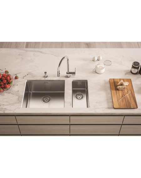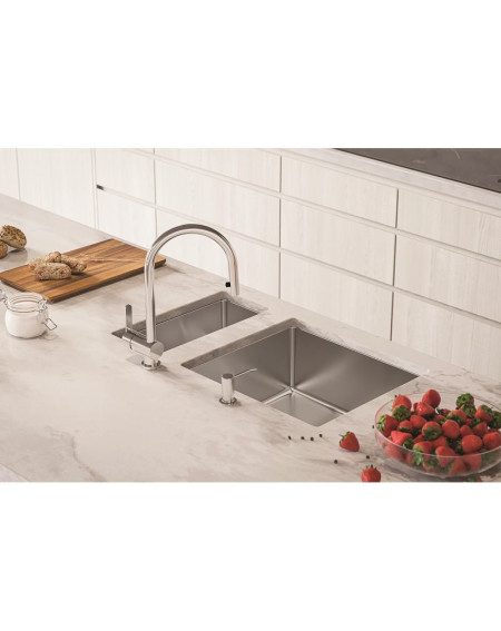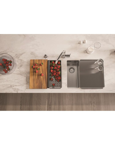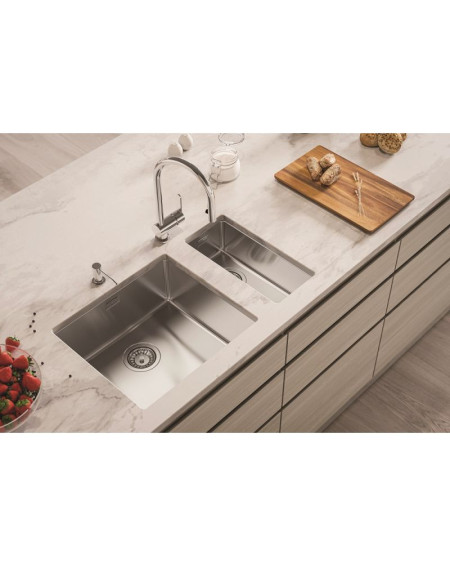 Plautuvės satininis (pusiau matinis) paviršius suteikia švelnų spindesį ir išlaiko estetiką ilgus metus. Montuojama po stalviršiu (U) konstrukcija leidžia sukurti vientisą, lengvai valomą virtuvės paviršių, be jokių išsikišančių briaunų. Plautuvė gali būti naudojama kaip papildoma darbo zona – vaisių ar daržovių plovimui, indų džiovinimui ar smulkiems paruošimo darbams. Rekomenduojame komplektuoti su ALVEUS nuvarvėjimo indu.