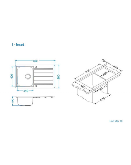 ALVEUS Line Max 20 nerūdijančio plieno plautuvė su nusausinimo zona. Tiesios linijos ir lygūs paviršiai sukuria modernų pojūtį ir yra patogūs valyti. Montavimas standartinis, iš stalviršio viršaus (I), kraštelis šiek tiek išsikiša virš stalviršio. Dėka tokio montavimo, šią plautuvę galima derinti su bet kokiu stalviršiu.