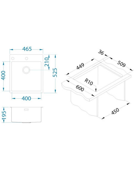 Erdvus 400x400x195 mm dubuo suteikia pakankamai vietos patogiam indų plovimui bei maisto ruošimui, o bendri matmenys (465x525 mm) užtikrina, kad plautuvė puikiai tilps net į spinteles nuo 450 mm pločio.