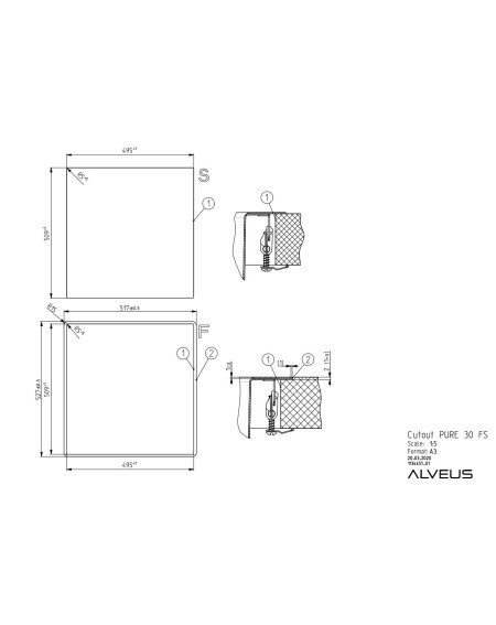 ALVEUS Pure 20 – nerūdijančio plieno plautuvė, išsiskirianti satininio paviršiaus (pusiau blizgaus, pusiau matinio) dubeniu ir šlifuoto paviršiaus kraštais. Skirtingų tekstūrų derinys suteikia plautuvei modernų, estetišką įvaizdį ir leidžia ją lengvai priderinti tiek prie minimalistinės, tiek prie prabangios virtuvės aplinkos. Šią plautuvę galima montuoti dviem būdais: įleisti į stalviršį (F) arba montuoti virš stalviršio, paliekant ploną kraštelį aukščiau (S). Įledžiamam (F) būdui plautuvė gali būti montuojama ant drėgmei atsparaus stalviršio: natūralaus akmens ar kompozito, kuris paruošiamas ir išfrezuojamas pagal brėžinį.