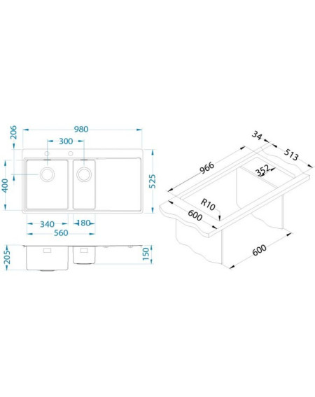 - Nusausinimo zona ir papildomas dubuo kairėje pusėje;