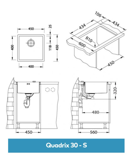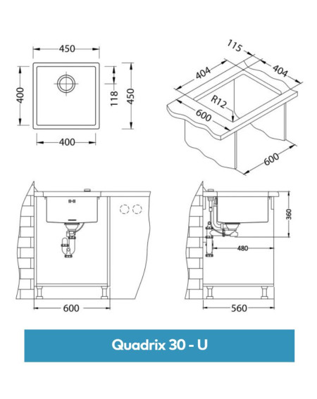 Ši plautuvė tinka spintelėms nuo 450 mm pločio (F ir S montavimo būdais) arba nuo 600 mm pločio (U montavimas), todėl ją lengva pritaikyti įvairaus dydžio virtuvėms „Quadrix 30“ galima naudoti kaip atskirą plautuvę arba derinti su kita „Quadrix“ serijos plautuve, taip sukuriant papildomą darbo zoną maisto ruošimui ar indų plovimui – tai ypač patogu erdviose virtuvėse ar profesionaliuose sprendimuose.