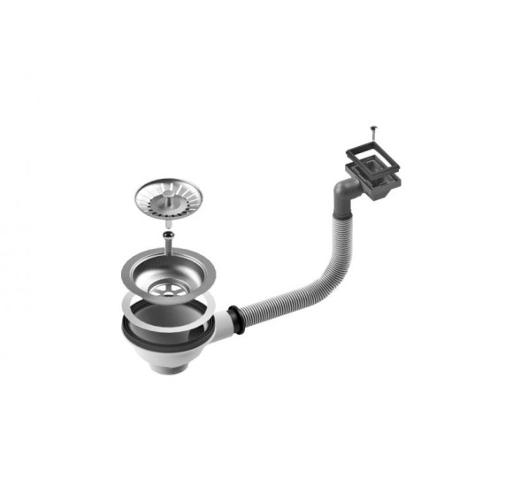 ALVEUS plautuvės dugno vožtuvas su persipylimu (⌀114). Plastikiniai elementai pagaminti iš ekologiškų polimerinių medžiagų, o metaliniai - iš nerūdijančio plieno. Vožtuvas užkemšamas jį paspaudus.