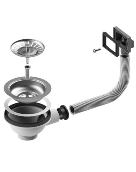 ALVEUS plautuvės dugno vožtuvas su persipylimu (⌀114). Plastikiniai elementai pagaminti iš ekologiškų polimerinių medžiagų, o metaliniai - iš nerūdijančio plieno. Vožtuvas užkemšamas jį paspaudžiant.