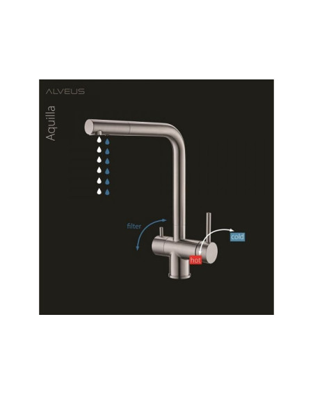 ALVEUS Aquila maišytuvas plautuvei - tai puikus pasirinkimas norint patogiai mėgautis švariu, filtruotu vandeniu. Dvi išbėgimo angos ir dviejų svirčių valdymas leidžia naudotis tiek įprastu karštu ar šaltu vandeniu, tiek filtruotu vandeniu. Trys skirtingi atspalviai: balta, smėlio ir juoda (carbon) dera prie ALVEUS granitinių plautuvių. Tai itin patogus ir funkcionalus pasirinkimas Jūsų virtuvei!