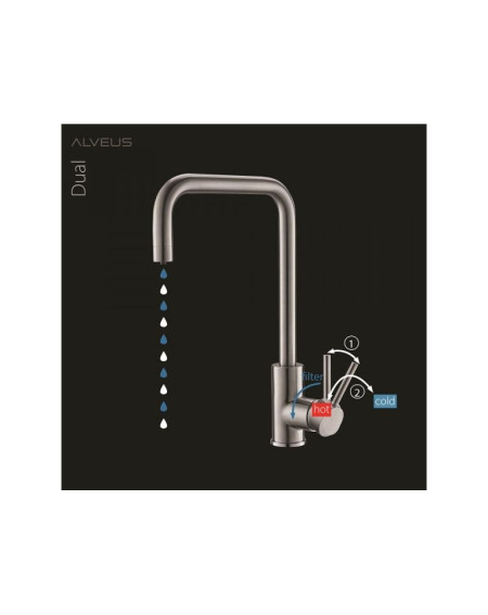 ALVEUS Dual maišytuvas plautuvei - tai puikus pasirinkimas norint patogiai mėgautis švariu, filtruotu vandeniu. Viena rankenėle galima valdyti karštą/šaltą ir filtruotą vandenį. Satininis: pusiau matinis paviršius suteikia modernią estetiką ir lengvai dera prie įvairių plautuvių. Tai itin patogus ir funkcionalus pasirinkimas Jūsų virtuvei;