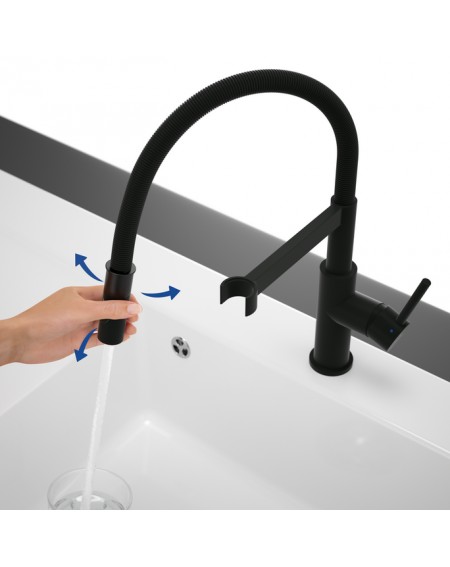 - Rankinis dušelis nusikabina nuo maišytuvo korpuso. Viršutinė korpuso dalis yra lanksti;