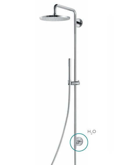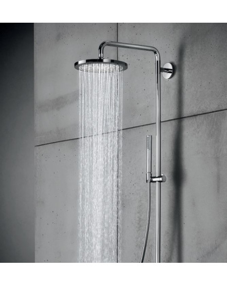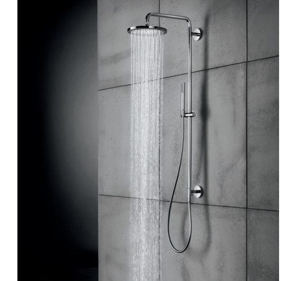 QD MagistroLab Classy - virštinkinis dušo stovo komplektas, kurį sudaro pasirenkamo dydžio "lietaus" dušo galva, stovas su vandens pajungimu apačioje, minimalistinis rankinis dušelis ir 1500 mm ilgio lanksti, nesusisukanti dušo žarna.