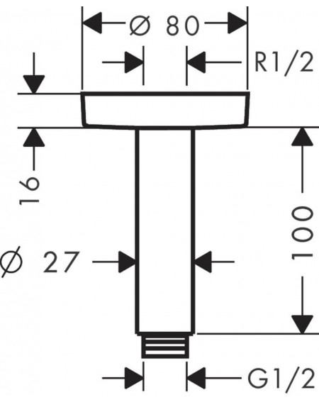 Hansgrohe S "lietaus" dušo galvos jungtis iš lubų. 100 mm ilgio alkūnė su 1/2" jungtimi tinka montuoti su įvairiomis standartinėmis dušo galvomis. Vamzdelio skersmuo 27 mm.