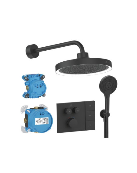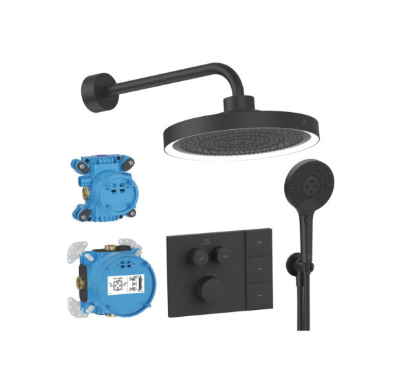 Ideal Standard CERATHERM NAVIGO SOLOS potinkinė termostatinė sistema su pulteliu valdoma dušo galva ir apšvietimu. Komplektas sudarytas iš visų montavimui reikalingų dalių - papildomai nieko įsigyti nereikia.