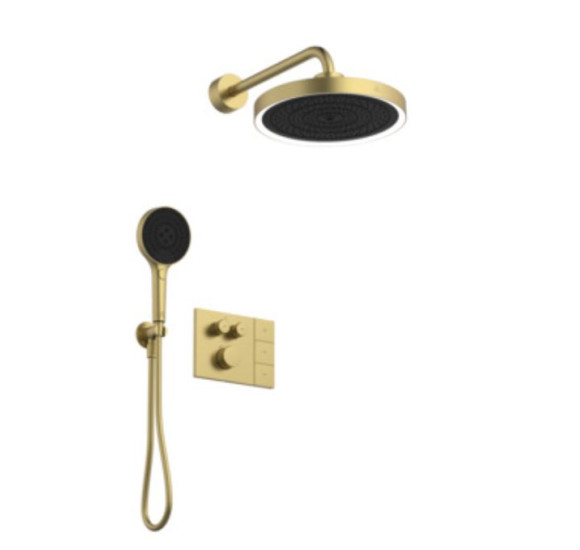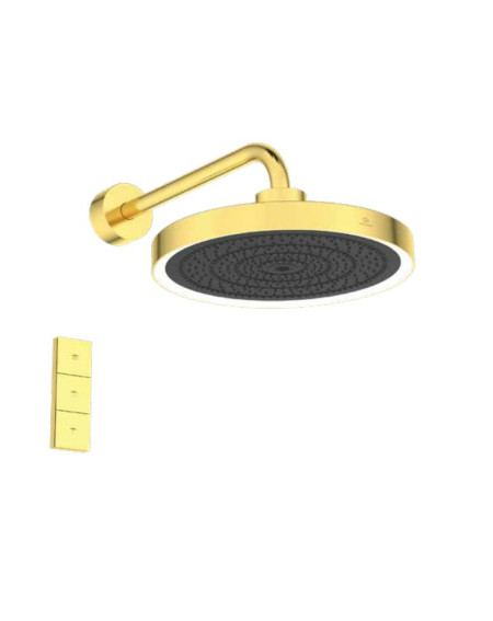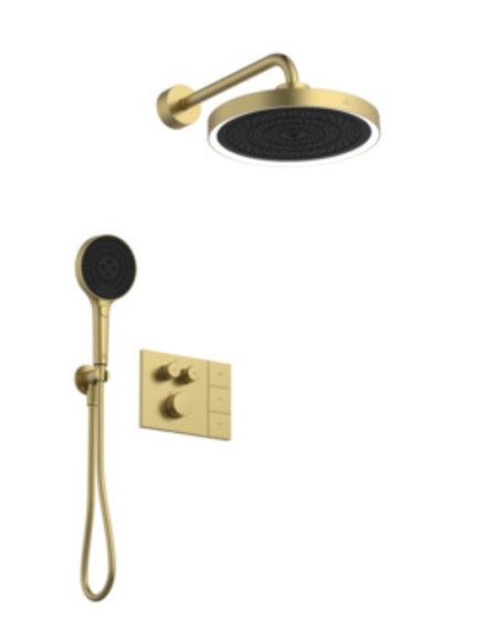 Ši sistema išsiskiria įspūdinga 330 mm skersmens viršutine dušo galva, turinčia trijų tipų purškimo režimus bei integruotą apšvietimą aplink purkštukus. Šviesa subtiliai pabrėžia vandens srautą ir suteikia dušo erdvei jaukumo bei prabangos įspūdį. Dėl silikoninių purkštukų, atsparių kalkėms, dušo priežiūra tampa itin paprasta. Purškimo režimus galima keisti nuotolinio valdymo pulteliu, kuris patogiai įsistato tiesiai į maišytuvo korpusą – viskas apgalvota iki smulkmenų.