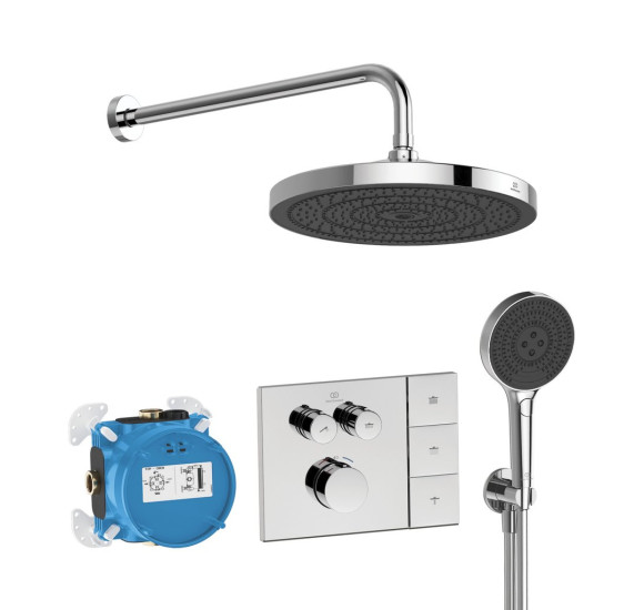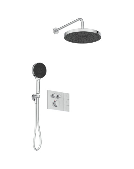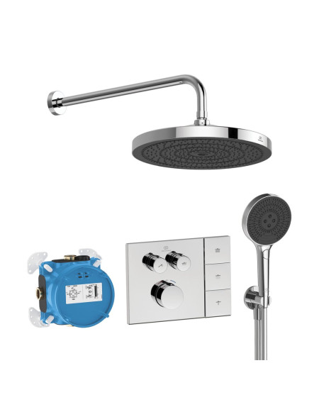 Ideal Standard CERATHERM NAVIGO SOLOS potinkinė termostatinė sistema su pulteliu valdoma dušo galva. Komplektas sudarytas iš visų montavimui reikalingų dalių - papildomai nieko įsigyti nereikia.