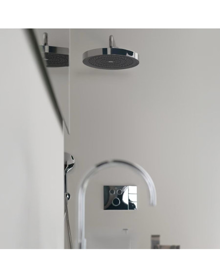 Komplektą papildo įspūdingo 300 mm skersmens „lietaus“ dušo galva su trimis purškimo režimais. Dėl silikoninių purkštukų ji atspari kalkių nuosėdoms ir išlieka lengvai valoma. Purškimo rėžimus galima keisti nuotolinio valdymo pulteliu, kuris estetiškai įsistato tiesiai į maišytuvo korpusą – viskas apgalvota iki smulkmenų.