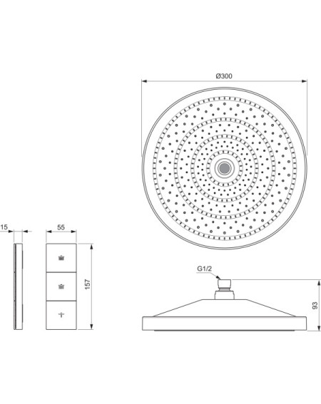 - Viršutinis dušas 300 mm skersmens, turi 3 purškimo rėžimus, atsparus kalkėms;