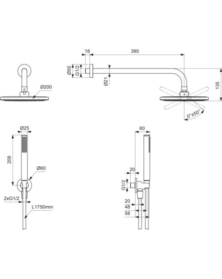 Komplekte rasite apvalią Ø200 mm skersmens „lietaus“ dušo galvą, kuri užtikrina tolygų ir malonų vandens srautą, bei 400 mm ilgio sieninę alkūnę, leidžiančią patogiai išdėstyti dušo sistemą erdvėje. Dušo galvą galima sukinėti, siekiant nustatyti norimą kryptį. Galima nukreipti žemyn arba pasukti iki 50 laipsnių kampu visomis kryptimis.