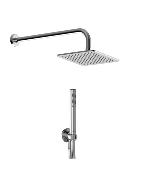 Komplekte rasite kvadratinę 200x200 mm dydžio „lietaus“ dušo galvą, kuri užtikrina tolygų ir malonų vandens srautą, bei 400 mm ilgio sieninę alkūnę, leidžiančią patogiai išdėstyti dušo sistemą erdvėje. Dušo galva ir cilindro formos metalinis rankinis dušelis pasižymi minimalistiniu dizainu, todėl puikiai dera tiek prie modernaus, tiek prie klasikinio interjero.
