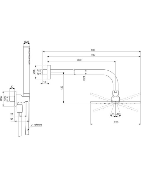 • Komplekte kvadratinė 200x200 mm "lietaus" dušo galva su 400 mm sienine alkūne;