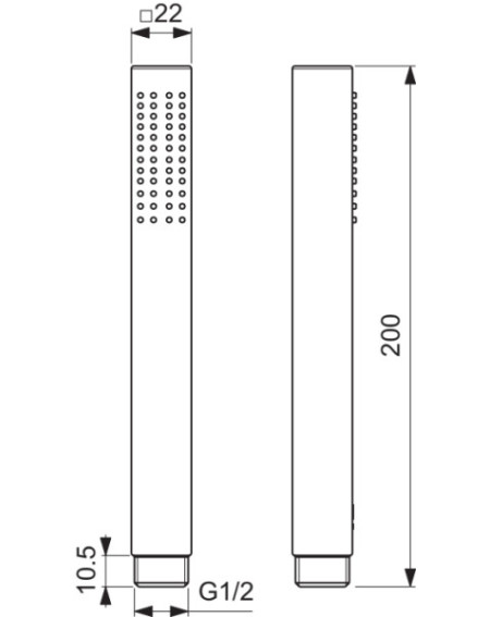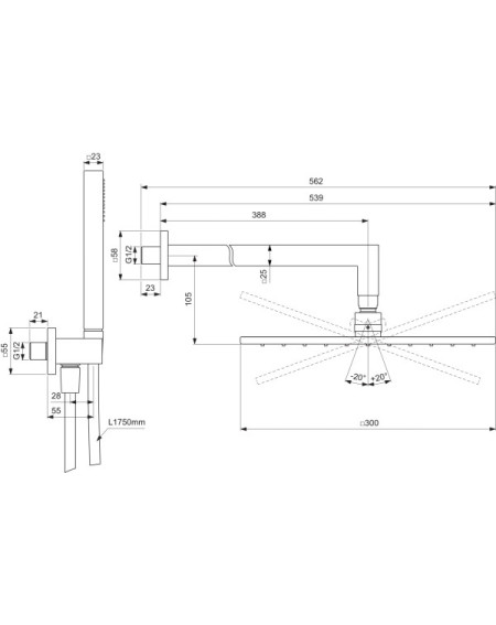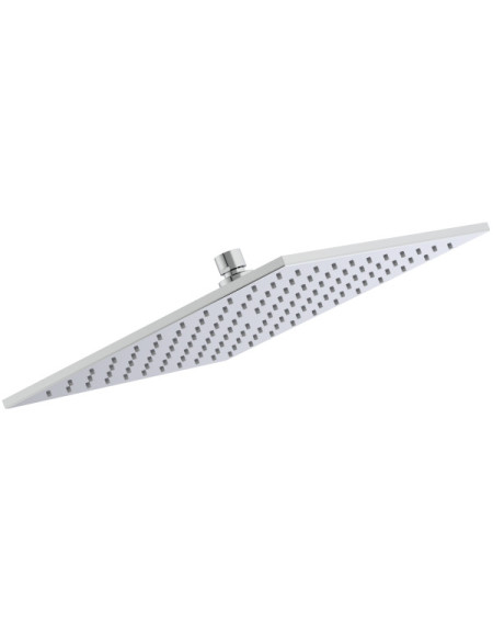 Komplekte esanti 300 x 300 mm kvadratinė metalinė „lietaus“ dušo galva su 400 mm ilgio sienine alkūne užtikrina malonų ir tolygų vandens srautą. Dušo galva gali būti sukiojama iki 20° kampu į visas puses, todėl kiekvienas galės nusistatyti patogiausią purškimo kampą pagal savo poreikius. Kampuotų formų minimalistinis rankinis dušelis – 200 mm ilgio ir 22 mm pločio – suteikia papildomo komforto kasdienio naudojimo metu ir puikiai dera prie bendros dušo sistemos estetikos.