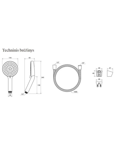 - Komplekte dušo galvutė, dušo žarna, laikiklis;