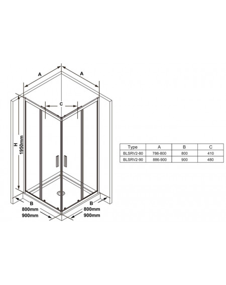 Montavimo matmenys: 886-900 mm x 886-900 mm, įėjimas - 480 mm.