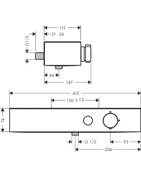 Su atbuliniu vožtuvu, triukšmo slopintuvu, S formos jungtimis. Pridedamas purvo filtras. Rankenėlių ir lentynėlės medžiaga: plastikas. Termostatas su mygtukiniu dušo paleidimu. Paspaudus mygtuką, ant kurio pavaizduotas dušas ima tekėti vandens srovė. Srovės stiprumą galima reguliuoti ratuku. Rekomenduojame kartu įsigyti ir Hansgrohe prekinio ženklo dušo galvutę.