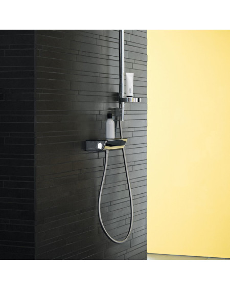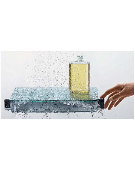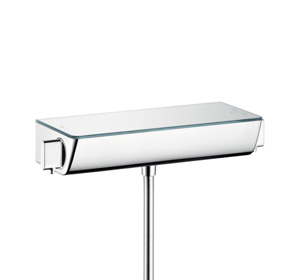 Hansgrohe "Ecostat Select' termostatinis maišytuvas dušui. Šios serijos termostatai pasižymi praktiškomis, patogiomis funkcijomis: vienas iš ypatybių - viršutinė dalis atlieka lentynos funkciją. Grūdinto stiklo lentynėlė leis patogiai susidėti prausimosi priemonės. Dėl „Ecostop“ mygtuko vandens suvartojimą galima sumažinti iki 10 l/min. vienu paspaudimu. Be to, temperatūrą galite tiksliai nustatyti pasukdami rankenėlę, o saugos užraktas ties 40 °C apsaugo jus nuo apsiplikymo.