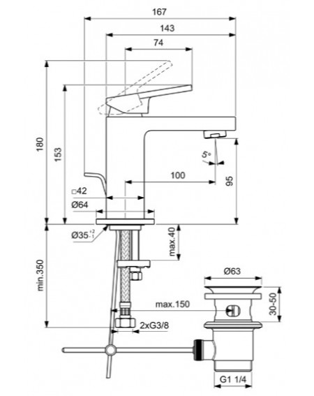 Ideal Standard Extra Piccolo maišytuvas praustuvui su dugno vožtuvu, BD502, pasirenkama spalva