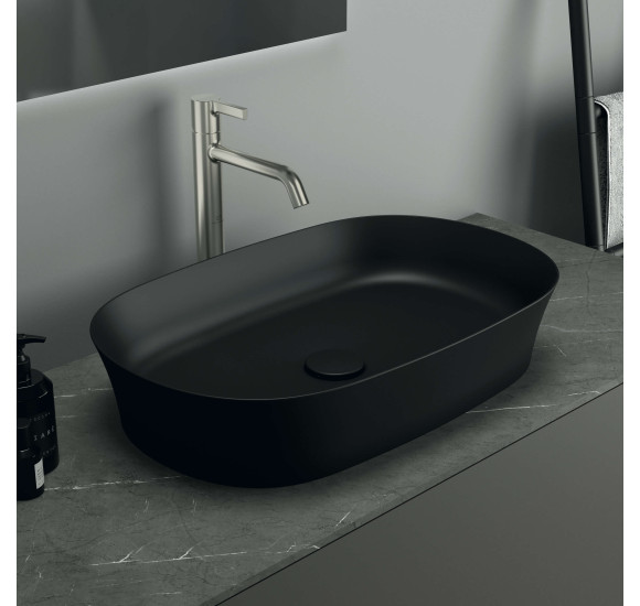 Ideal Standard Ipalyss E1396V3 ant stalviršio pastatomas praustuvas 60 cm - ovalo formos, juodos matinės spalvos praustuvas, skirtas montuoti ant stalviršio, be persipylimo angos. Plonos, tačiau atsparios ir tvirtos praustuvo sienelės suteikia elegantišką išvaizdą.