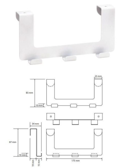 Baltos spalvos kabliukas turi tris pasikabinimo kilpeles. Kabliukas pagamintas iš plieno. Užkabinamas ant durų ir prisukamas varžteliais iš viršaus.
