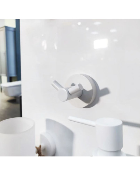 Bemeta White dvigubas ant sienos tvirtinamas kabliukas voniai, baltos spalvos. Kabliukas turi dvi pasikabinimo kilpeles. Tinka tiek rankšluosčiams ar drabužiams, tiek sunkesniems chalatams. Pagamintas iš patvaraus žalvario.