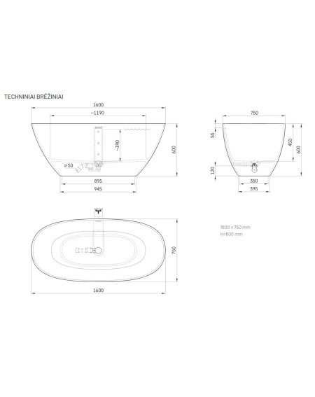 - Dydis: 1600 x 750 mm, aukštis: 600 mm;